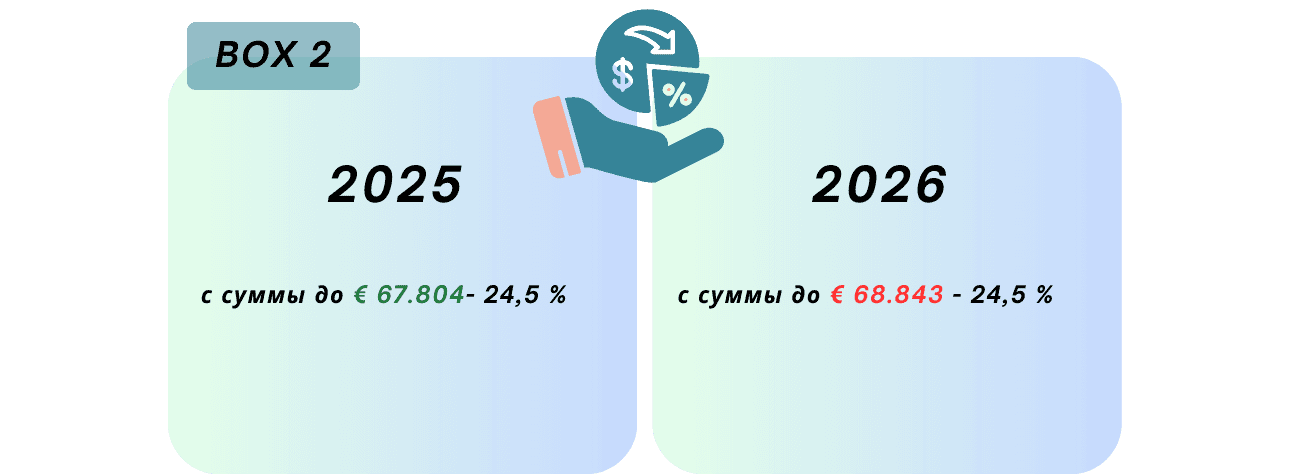 € 67.804. В 2026 году эта ставка будет применяться к сумме до € 68.843. С вышеуказанного предела в 2026 году, так же как и в 2025-м, применяется ставка налога 31 %.